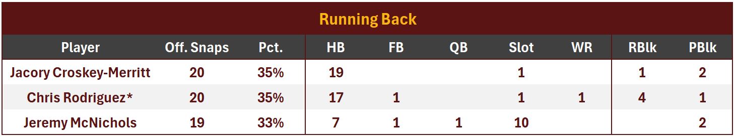 Jeremy McNichols was used more as a slot receiver than a RB, continuing the trend since Week 2. He had 2 rushing attempts for 3 yds (Success Rate 0%) and caught 1/2 passing targets for 0 yds.