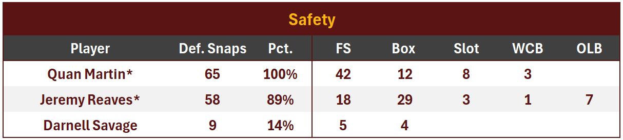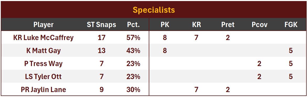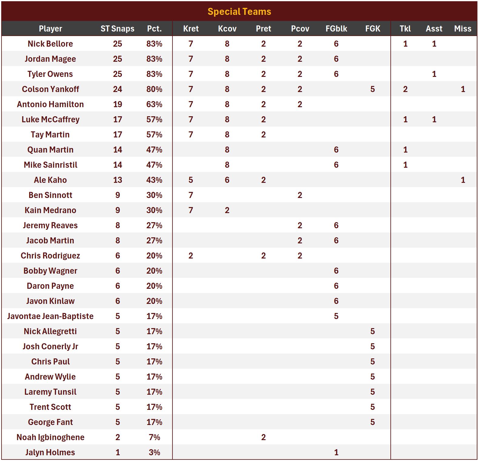 Colson Yankoff led the coverage units with 2 tackles but also missed 1. Nick Bellore and Luke McCaffrey tied with 1 tackle and 1 assist apiece. Quan Martin and Mike Sainristil each made 1 tackle. Reserve LB Ale Kaho missed 1 tackle and suffered a concussion.