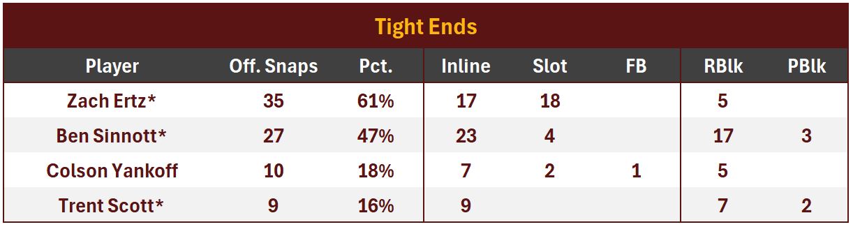 The Commanders’ utilization of tight ends in Atlanta was more conventional than we’ve seen in previously this season, with the exception of OT Trent Scott remaining in the rotation as an extra blocker.