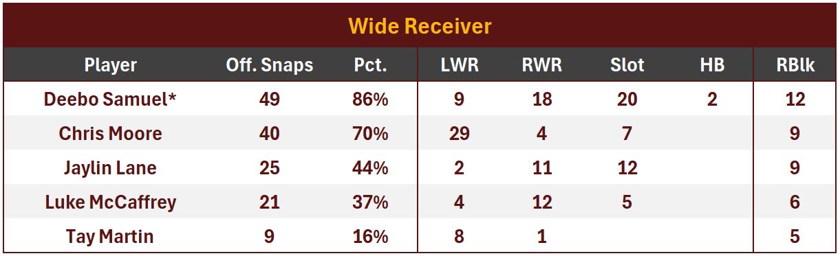 Deebo Samuel led the Commanders in receiving yards (72), TDs (1, tie with Luke McCaffrey), first downs (4), targets (6), receptions (6), reception rate (100%, tie with Bill and Tay Martin), and contested catches (3/3). He was the Commanders’ second most productive receiver on a per-route basis at a very respectable 2.48 Yards/Route Run. Surprisingly, his 66.7% Receiving Success Rate was only third best on the team (tie with Luke McCaffrey and Tay Martin).