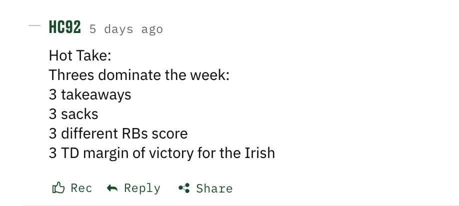 Your Takes: Please leave your takes below (hot, cold medium-any temp). I will feature the Top Takes next week. GO IRISH!
