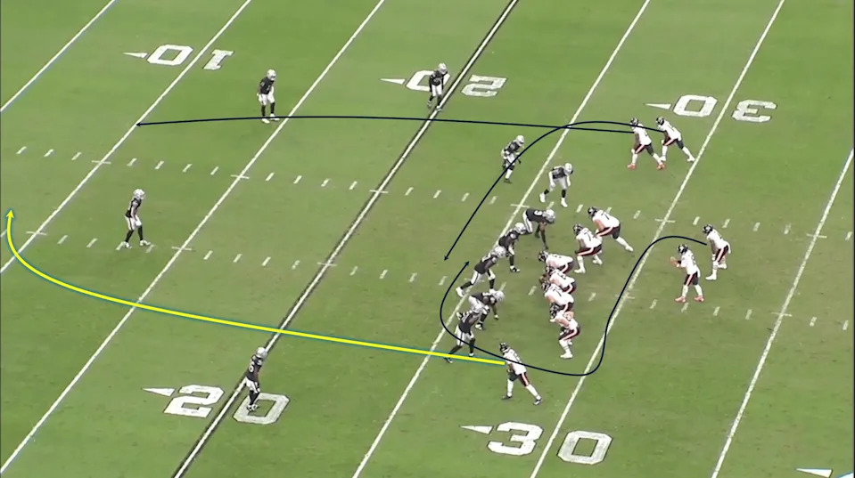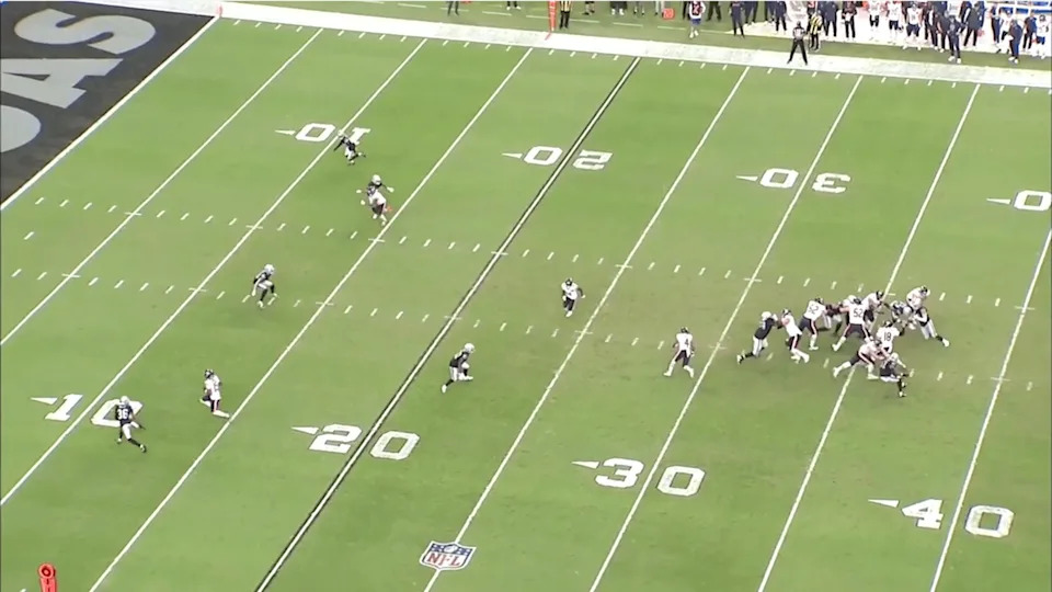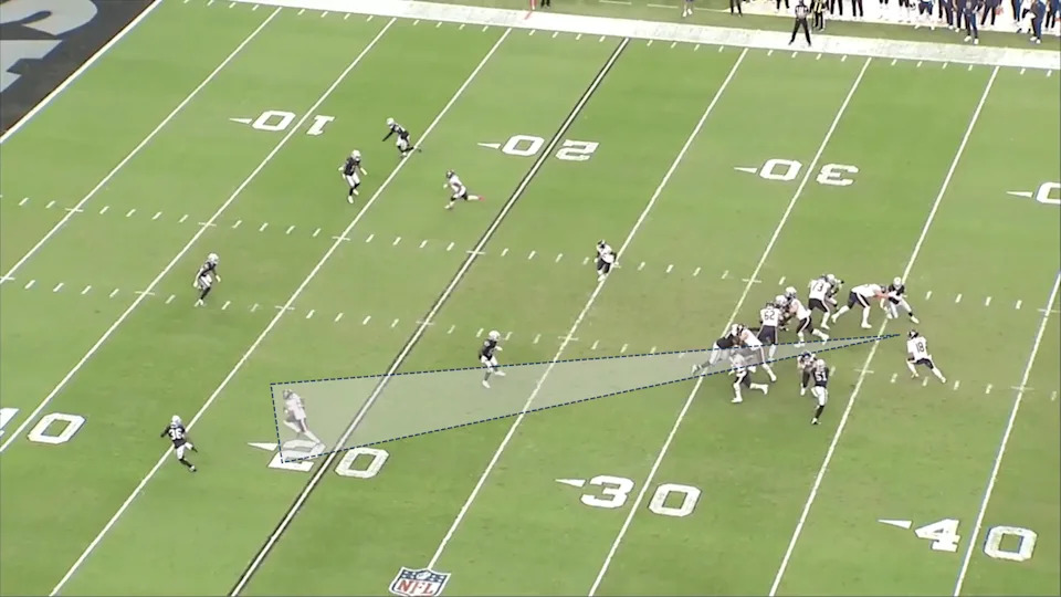 The Raiders are showing pre-snap pressure in a double-A gap “mug” look with seven defenders crowding the line of scrimmage.