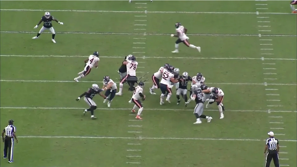 Speaking of turnovers, the Bears’ defense generated four takeaways for the second-straight week, bringing their season total up to nine, which ranks third-best in the league, as does their plus-five turnover margin. A lot of credit needs to be given to defensive backs coach Al Harris, who was a gambler himself as a player. The defensive backs are clearly recognizing patterns based on formation and down-and-distance and their coaching and scouting is paying off. Kevin Byard was outstanding all game and he hawked Raiders quarterback Geno Smith twice on an in-breaker from the slot. Tyrique Stephenson was Johnny-on-the-spot with a fumble recovery, but also had an incredible diving interception from a trail technique on a crosser. Stephenson has been outstanding in back-to-back games.