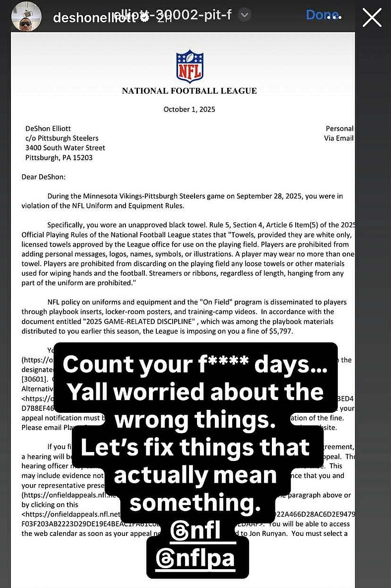 Elliott, who tagged the NFL and NFLPA in the post, also included that letter from the league office that informed him that he was fined.