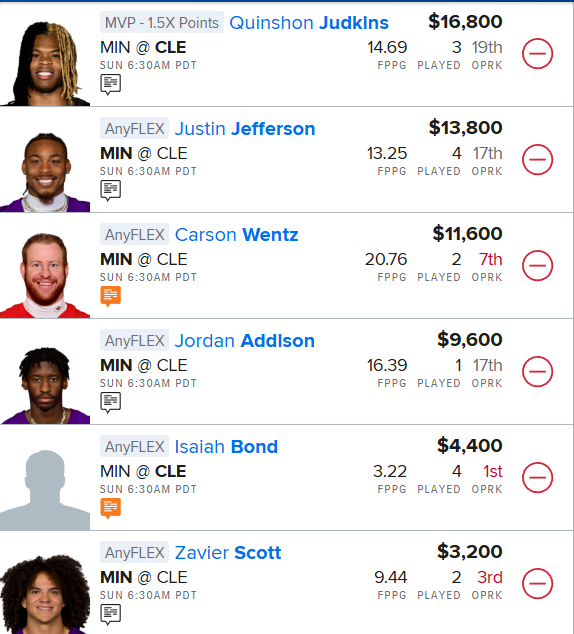 The Vikings had no issue playing him to his full potential last week; he played in 96% of snaps, and that should continue here. He should find himself lined up against Greg Newsome, who gives up .37 fantasy points per route run this season. We are still getting a good price on him here as well.