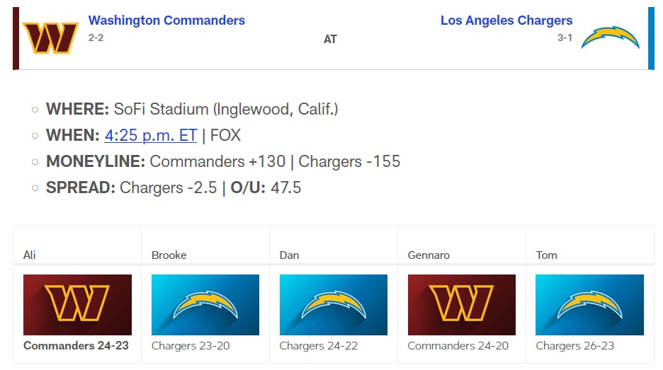 Both the Washington Commanders and the Los Angeles Chargers are coming off brutal losses, although their Week 4 results exposed different issues in each team’s game play. Washington’s defense had trouble stopping Atlanta on all fronts, allowing the Falcons’ offense 435 total yards (307 passing/128 rushing) and 6.8 yards per play. Quarterback Michael Penix Jr. had his way, finishing with a 76.9% pass completion rating, throwing for 313 yards, two touchdowns and one interception. Atlanta’s tandem running backs in Bijan Robinson and Tyler Allgeier rushed for a combined 33 carries and 126 yards, with Robinson picking up an additional 106 yards on four receptions.
