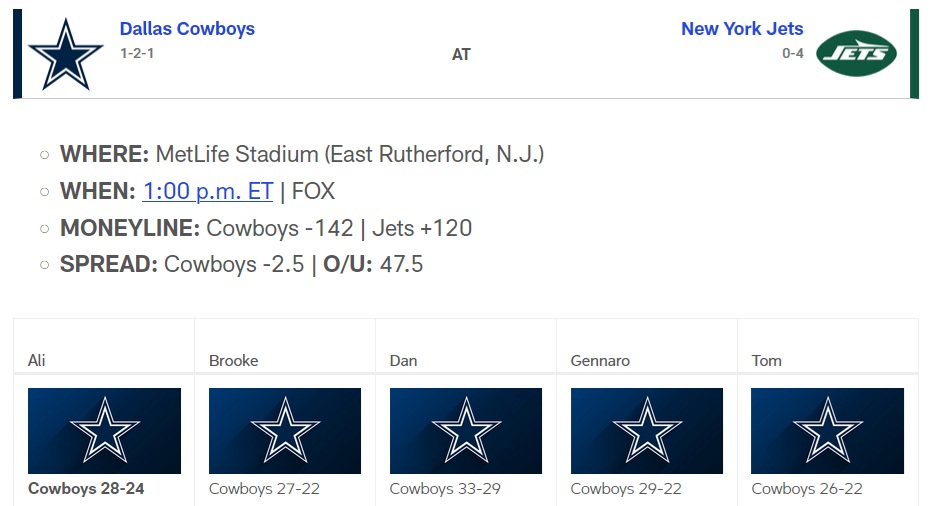 Why Gennaro picked the Cowboys: Lost in all the drama that continually envelopes Jerry Jones’ content machine/football team: Dak Prescott is still a pretty damn good quarterback. The MVP runner-up in 2023, Prescott became the highest-paid player in NFL history just prior to last year’s kickoff. But the 60 Million Dollar Man’s 2024 campaign started slowly and ended prematurely, with a crippling hamstring injury sidelining him for the final nine games. Subsequently, Prescott received little fanfare entering this season. It kinda felt like everyone forgot about Dak. Clearly, though, the 32-year-old can still sling it, as evidenced by his league-high 1,119 passing yards in September. He’s been efficient, too, completing nearly 73 percent of his throws while accumulating the best Pro Football Focus grade among full-time starting signal-callers. And in this past Sunday night’s 40-40 tie with Green Bay, Prescott found his comfort zone with George Pickens, connecting with the new toy eight times for 134 yards and two touchdowns. All of this spells trouble for a Jets defense that’s transitioning — slowly — to Aaron Glenn’s aggressive press-man scheme. New York ranks in the bottom five in points allowed, defensive EPA/per play and QB pressures, per Next Gen Stats. Granted, Dallas’ D has been equally porous, but I’m not as confident in Justin Fields making that unit pay. Cowboys DC Matt Eberflus is quite familiar with the quarterback’s game, having been his head coach for two years in Chicago. Lastly, Dallas’ two defeats have come in the two games where the Cowboys lost the turnover battle. In related news, the Jets are the only team without a single takeaway this season.