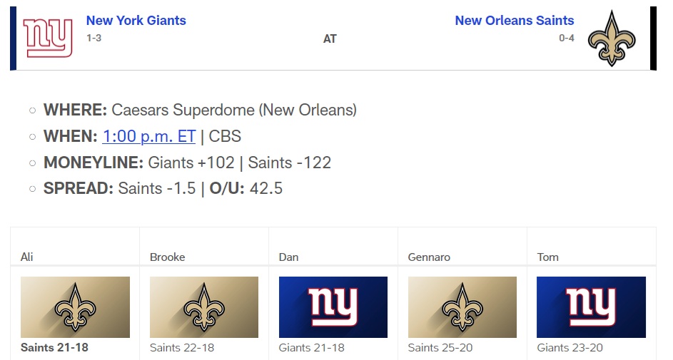 Why Dan picked the Giants: Both teams are struggling to find their way, and no result would surprise me in this one. The Giants seem closer to having a sense of how to win, though. They beat one of the most impressive squads of the early going in 2025, pummeling a weakened Chargers offensive line for 21 pressures, the most of any team in Week 4. New York notched its first victory of the season last week despite losing its best offensive player early on in its quarterback’s first career start. I respect the Saints’ scrappiness, but I’ve yet to see them show the resiliency the Giants displayed against the Bolts. Jaxson Dart has injected new life into the offense, and the combination of Brian Burns, Abdul Carter, Dexter Lawrence and Kayvon Thibodeaux is a lot for any offensive line to handle, especially a banged-up one like New Orleans has at the moment. Sunday will present an excellent chance for Saints QB Spencer Rattler to earn his first career win (0-10 as a starter) a week after Dart nailed it on his first try. Rattler’s played better than his record would indicate, but I need to see him log a W before I can truly believe.