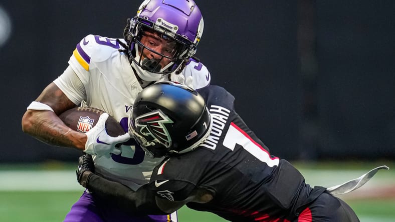 Nov 5, 2023; Atlanta, Georgia, USA; Minnesota Vikings wide receiver Trishton Jackson (9) runs against Atlanta Falcons cornerback Jeff Okudah (1) during the second half at Mercedes-Benz Stadium. Mandatory Credit: Dale Zanine-USA TODAY Sports