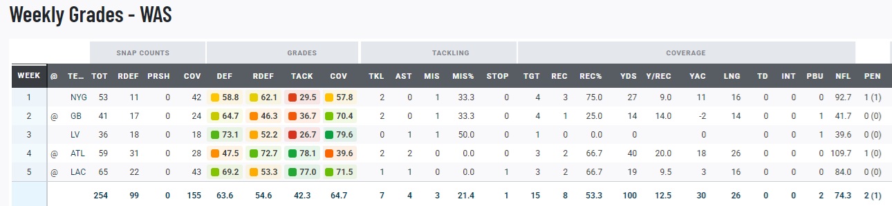 Trey Amos has played on 76% of Washington’s defensive snaps in his short 5-game career. Again, for reference, here are his PFF scores for those 5 games:
