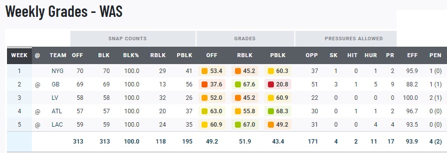 Conerly has stepped in as the Commanders starting right tackle from Day 1. For what they’re worth, here are PFF’s stats and grades for Conerly’s 5 games: