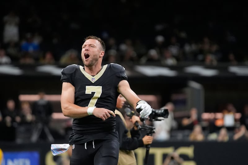 New Orleans Saints tight end Taysom Hill (7) leads the crowned in a cheer before a game against the New York Giants in New Orleans, Sunday, Oct. 5, 2025. | Gerald Herbert, Associated Press Takeaway central