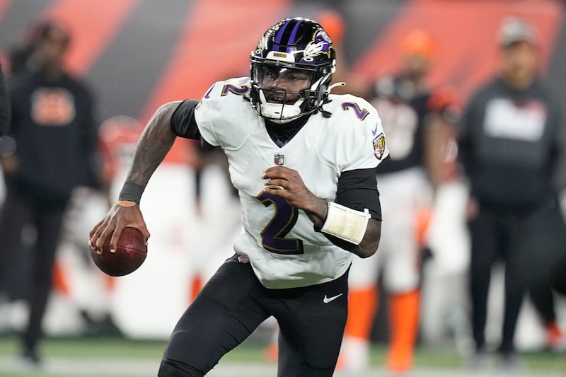Baltimore Ravens quarterback Tyler Huntley runs with the ball during the second half of NFL wild-card playoff football game against the Cincinnati Bengals in Cincinnati, Sunday, Jan. 15, 2023. The Bengals won 24-17. | Darron Cummings, Associated Press