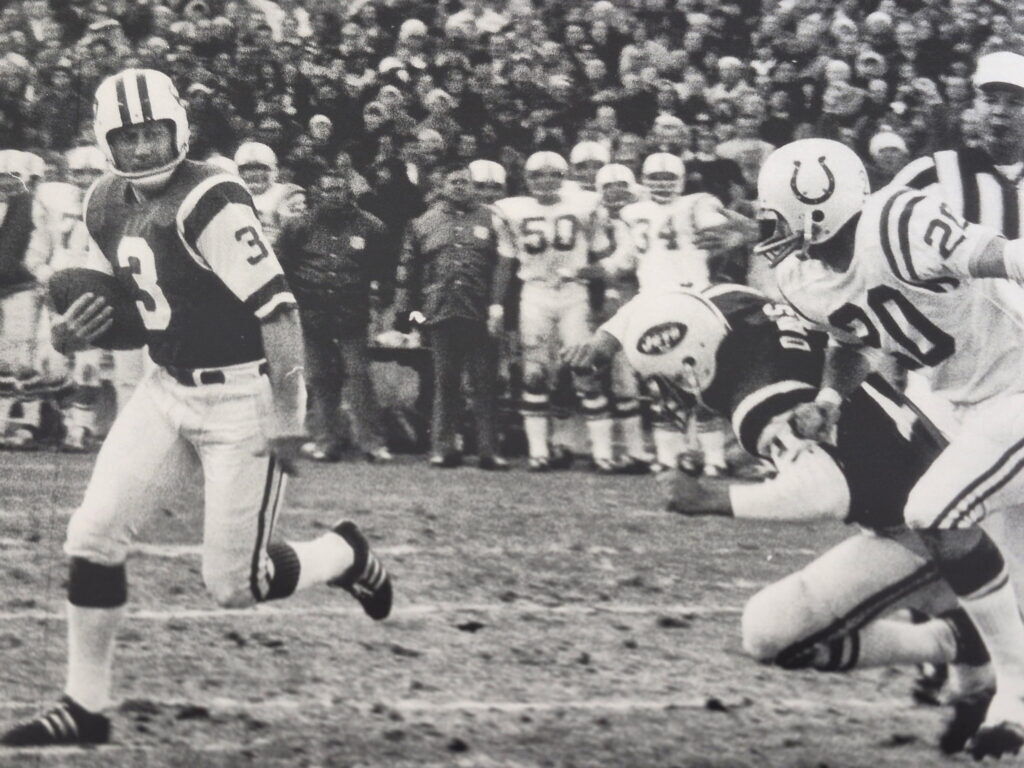 Kicker Bobby Howfield, who played for the New York Jets from 1971-74, running with the ball against the Baltimore Colts. Howfield also played for the Denver Broncos from 1968-70. (Photo courtesy of Ian Howfield)