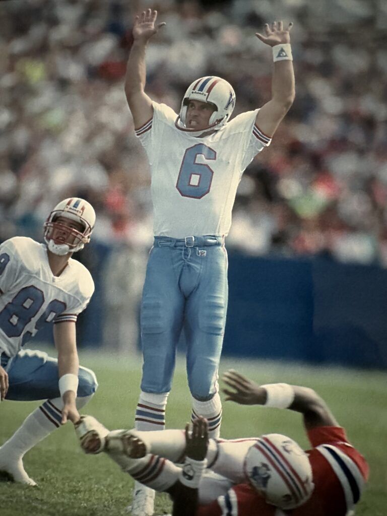 Ian Howfield makes a field goal for the Houston Oilers against the New England Patriots on Sept. 22, 1991, at Foxboro (Mass.) Stadium. (Photo courtesy of Ian Howfield)