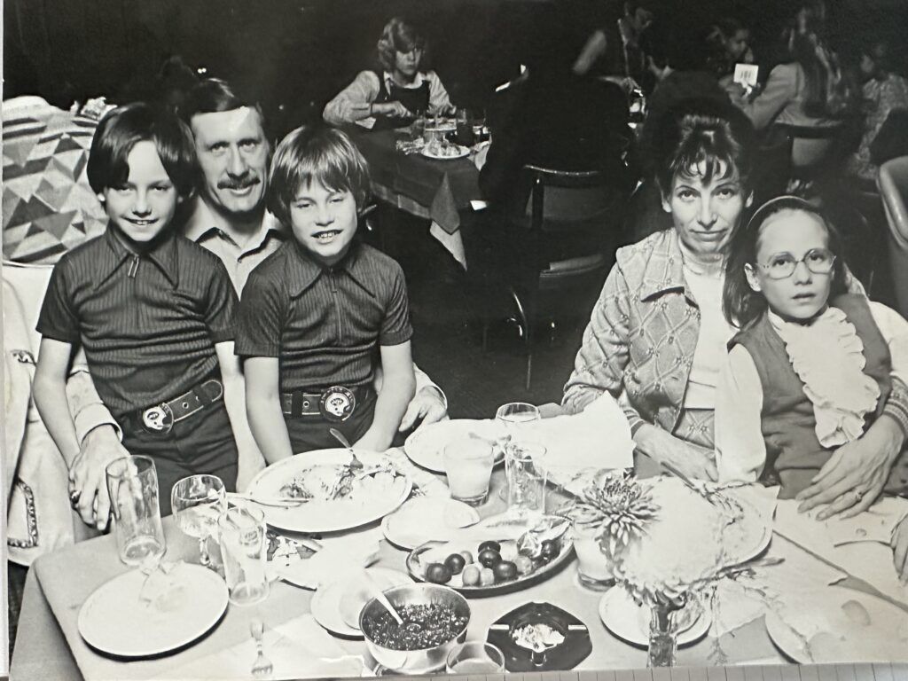 Bobby Howfield, holding the two boys, at the 1973 New York Jets’ Thanksgiving dinner with his family. (Photo courtesy of Ian Howfield)