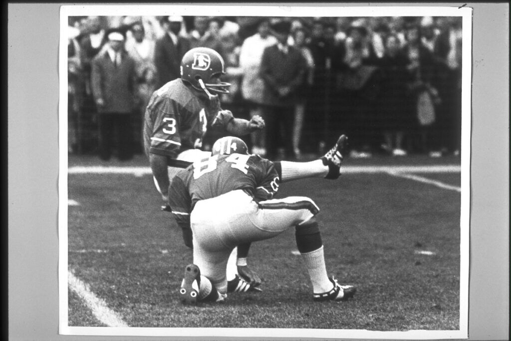 Kicker Bobby Howfield, who played for the Denver Broncos from 1968-70, with an attempt from the hold of wide receiver Mike Haffner. (Photo courtesy of Ian Howfield)