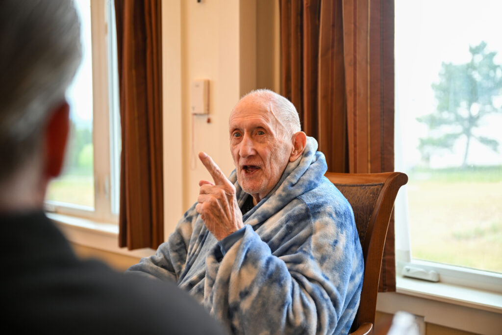 Bobby Howfield, left, and his son, Ian Michael Howfield, talk with a reporter about Bobby’s time as a place kicker for the Denver Broncos in the late 1960s as they relax at a retirement home in Highlands Ranch on July 31, 2025. (Stephen Swofford, The Denver Gazette)