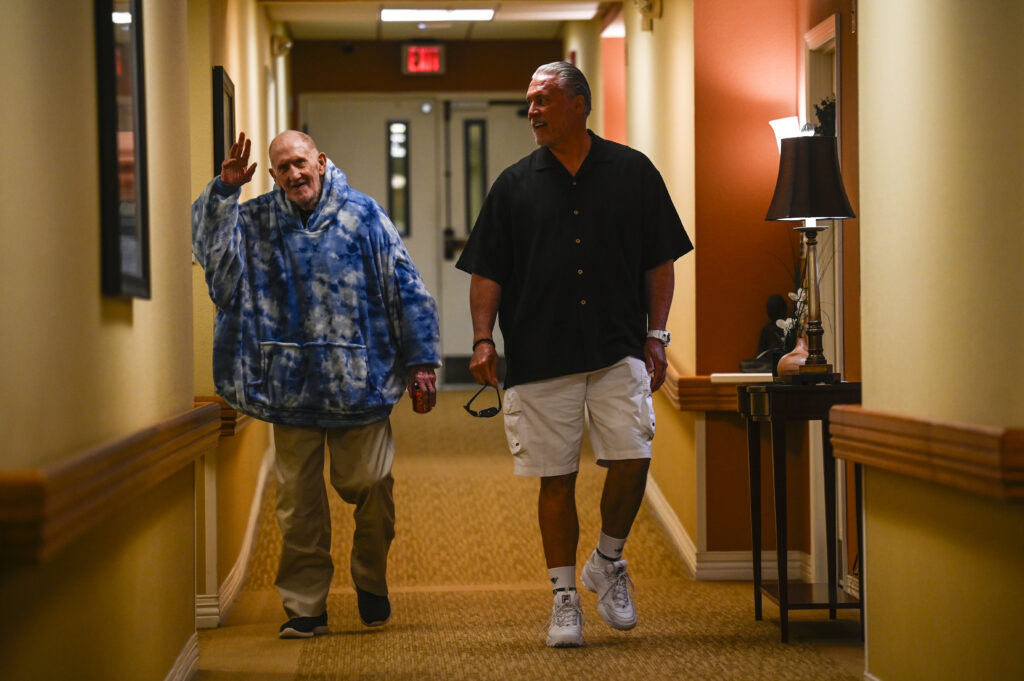 Bobby Howfield, left, walks down the hallway from his room with his son, Ian Michael Howfield, at a retirement home in Highlands Ranch on July 31. (Stephen Swofford, Denver Gazette)
