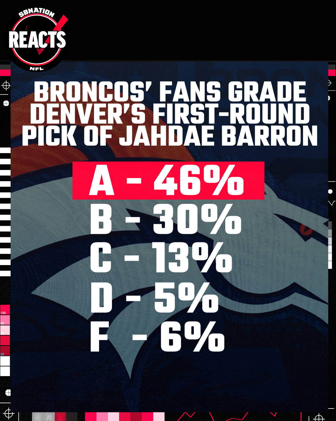 We already know the fans loved our first round pick from our FanDuel Sportsbook sponsored SB Nation reacts survey. 76% of us loved the pick of Jahdae Barron and I am sure those of us who voted it down a bit likely came around to the pick once we had a chance to sleep on it.