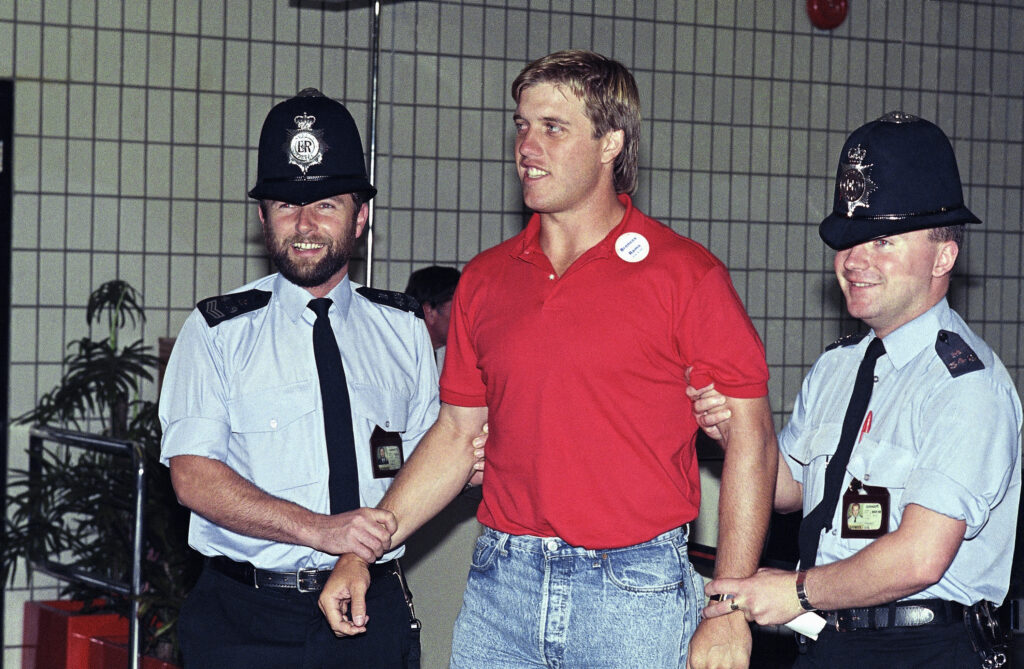 Denver Broncos quarterback John Elway jokes with two British policemen upon his team?s arrival outside Gatwick Airport on Monday, August 3, 1987 in London. The Broncos are in town to meet the Los Angeles Rams in an exhibition football game at London?s Wembley Stadium on August 9. (AP Photo/Dave Gaywood)
