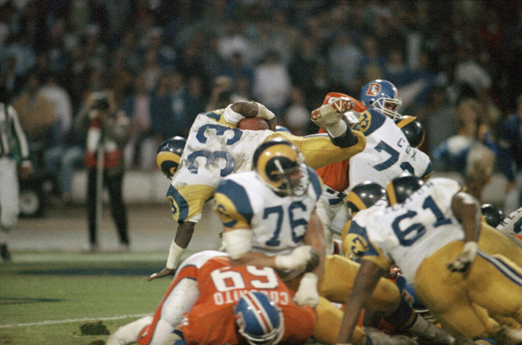 Los Angeles Rams running back Charles White, 33, goes up and over, reaching for the goal line at lower left, for his second touchdown against the Denver Broncos in the American Bowl at London’s Wembley Stadium, Aug. 9, 1987. White scored from four yards out, tying the game at 27-27 with less than a minute to go. The Rams went on to win 28-27. (AP Photo/Doug Pizac)