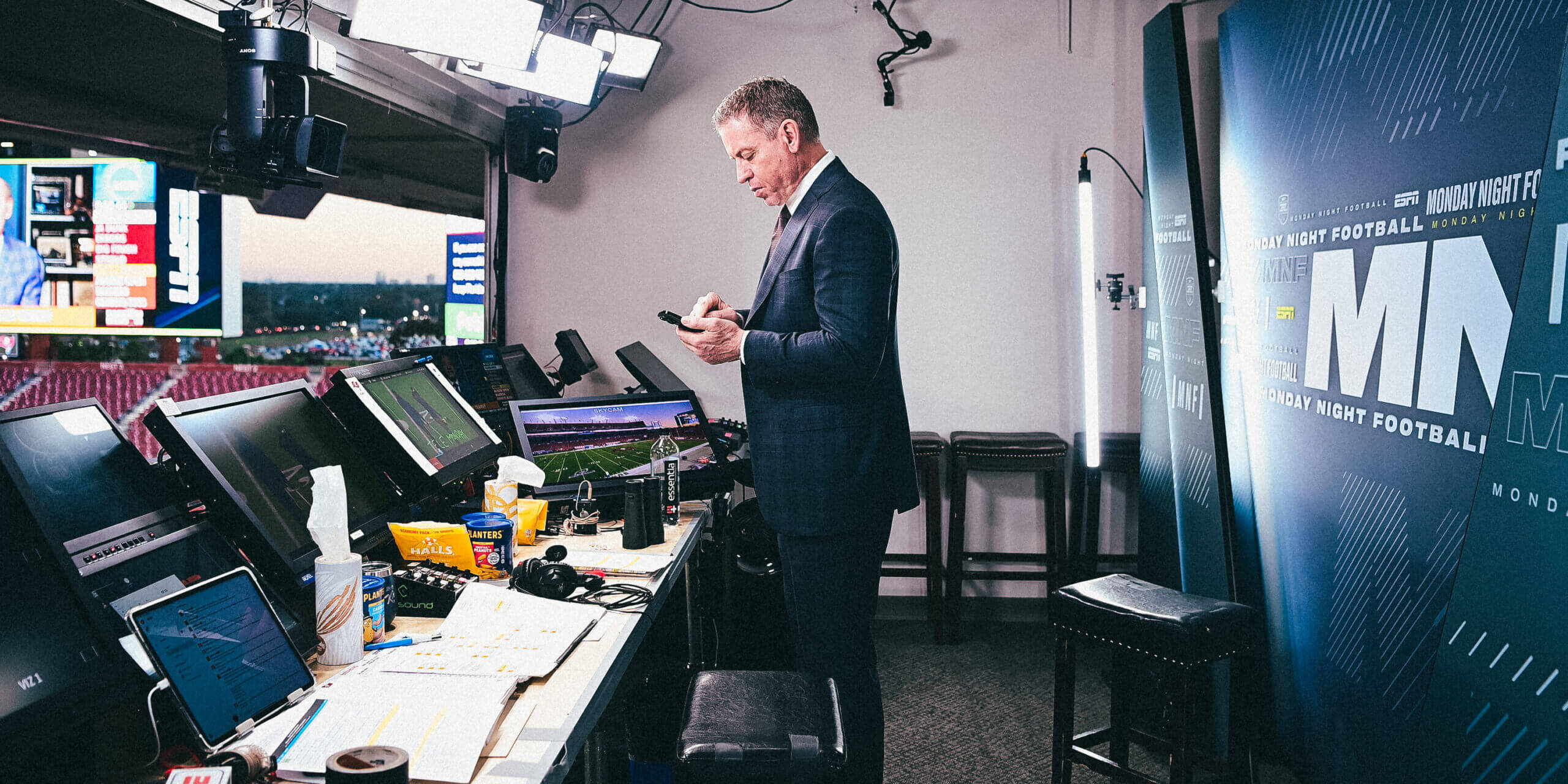 The routine never changes. Aikman needs it. After the game ends Monday night, he takes notes while he watches a replay on his flight home — Aikman owns his own jet and flies private to and from every game — then starts prep for the following week first thing Tuesday morning. He designed his own spotting boards before his first year in the booth, back in 2001, and he’s been using them ever since. He prints them out on Thursdays, color codes them, then adds notes all the way up until kickoff. He refuses to go into a game anything less than completely prepared.