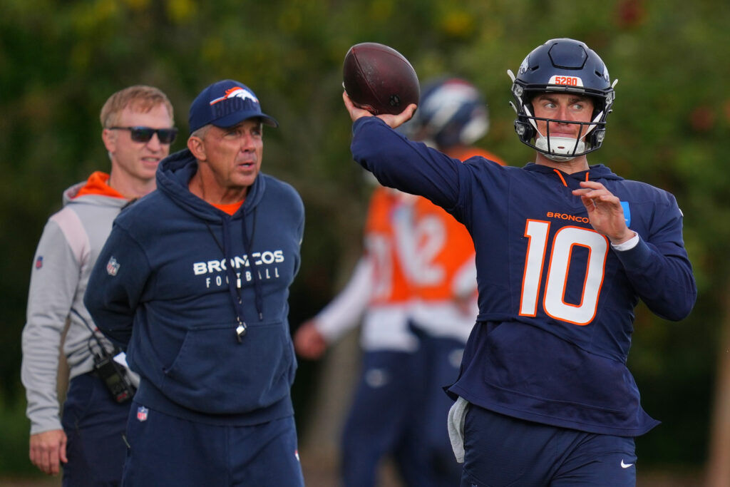 Denver Broncos head coach Sean Payton, left, watches as Denver Broncos quarterback Bo Nix (10) throws during an NFL training session at Tottenham Hotspur training ground in London, Wednesday, Oct. 8, 2025. (AP Photo/Kirsty Wigglesworth)