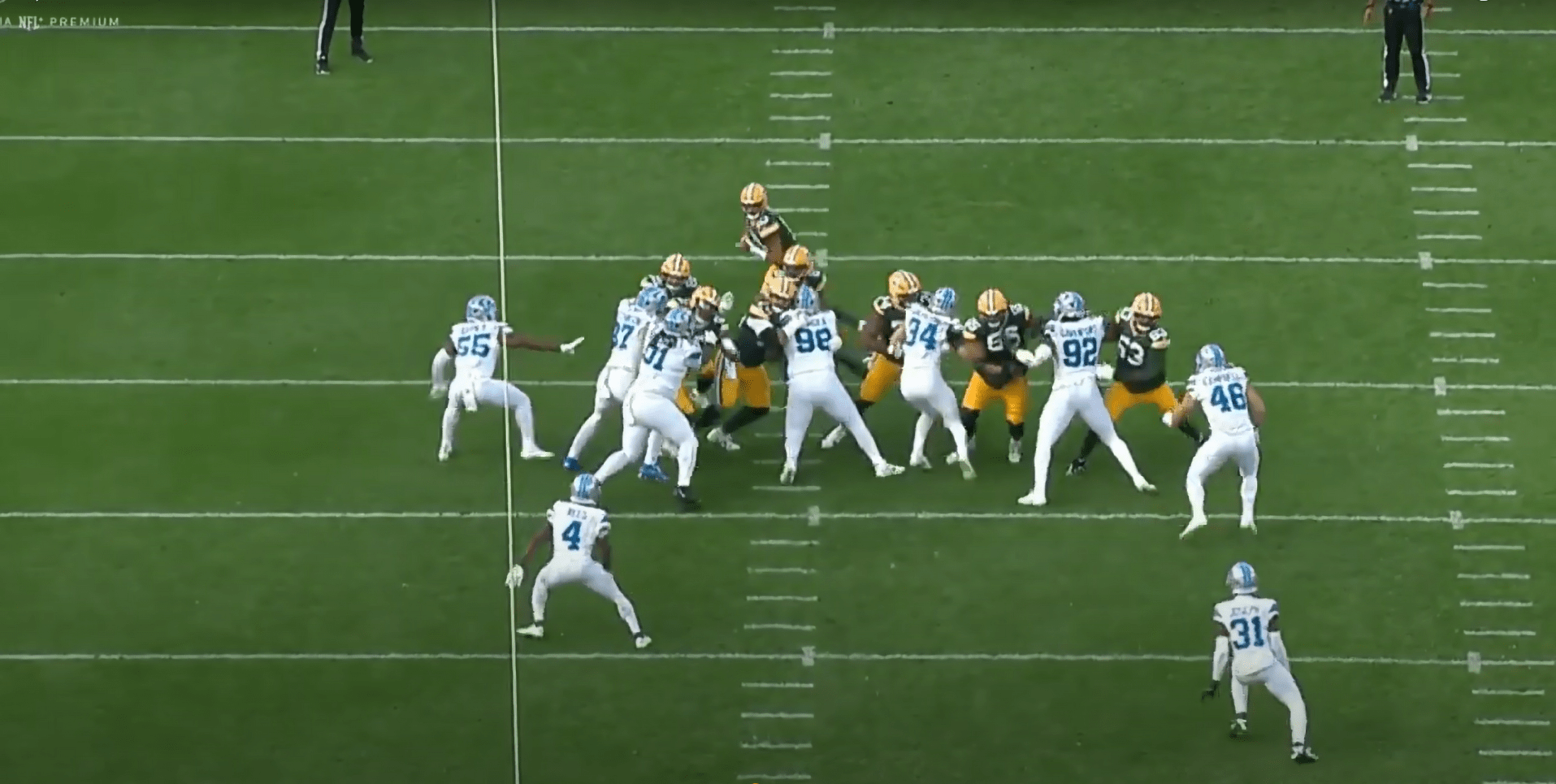 Next up is one of my favorite plays from this study because it shows how dominant the Lions can be against the run when they really want to be. Detroit deploys five defenders along the line of scrimmage, with linebacker Derrick Barnes to the left of your screen and defensive end Marcus Davenport to the right. Inside, you have Hutchinson lined up on the inside shoulder of the in-line tight end, Williams at the three-technique, and Reader at the one-technique. Simply put, that is a problem to run the football against.