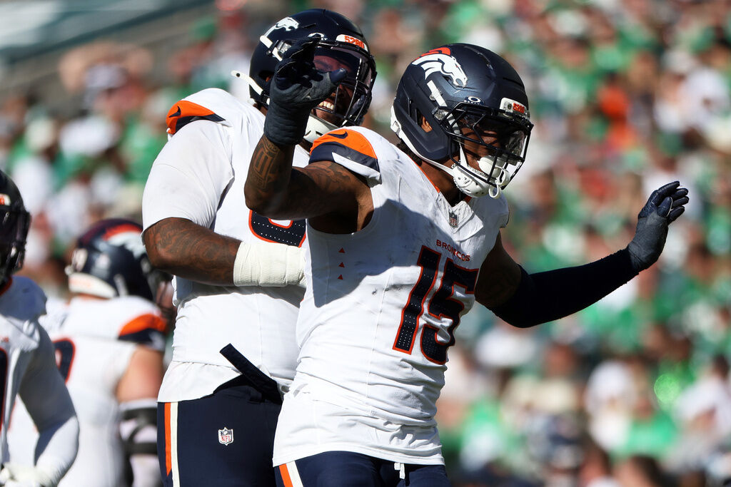 Denver Broncos linebacker Nik Bonitto (15) celebrates during an NFL football game against the Philadelphia Eagles, Sunday, Oct. 5, 2025, in Philadelphia. (AP Photo/Daniel Kucin Jr.)