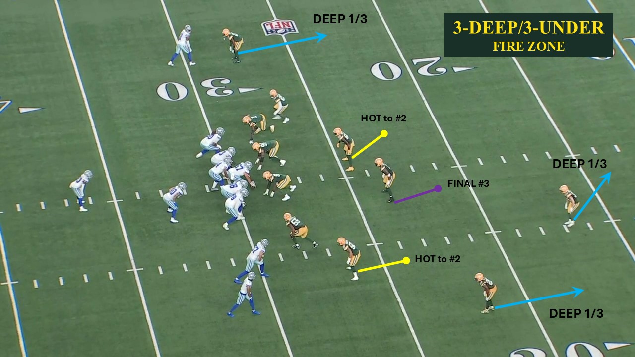 This pulls the strength of the Packers’ defense to the four receiver side, but the rotation post-snap is 5-man pressure cover-3 (3-deep/3-under zone).