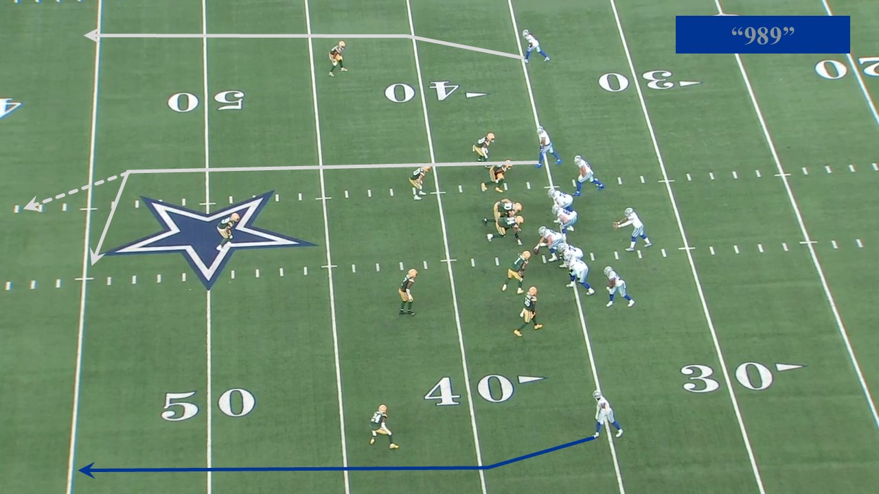On the crucial play in overtime, the Cowboys called the same “989” concept again. This time, the Packers defense had the outside routes covered up, playing cover-3, while the inside post route was wide open.
