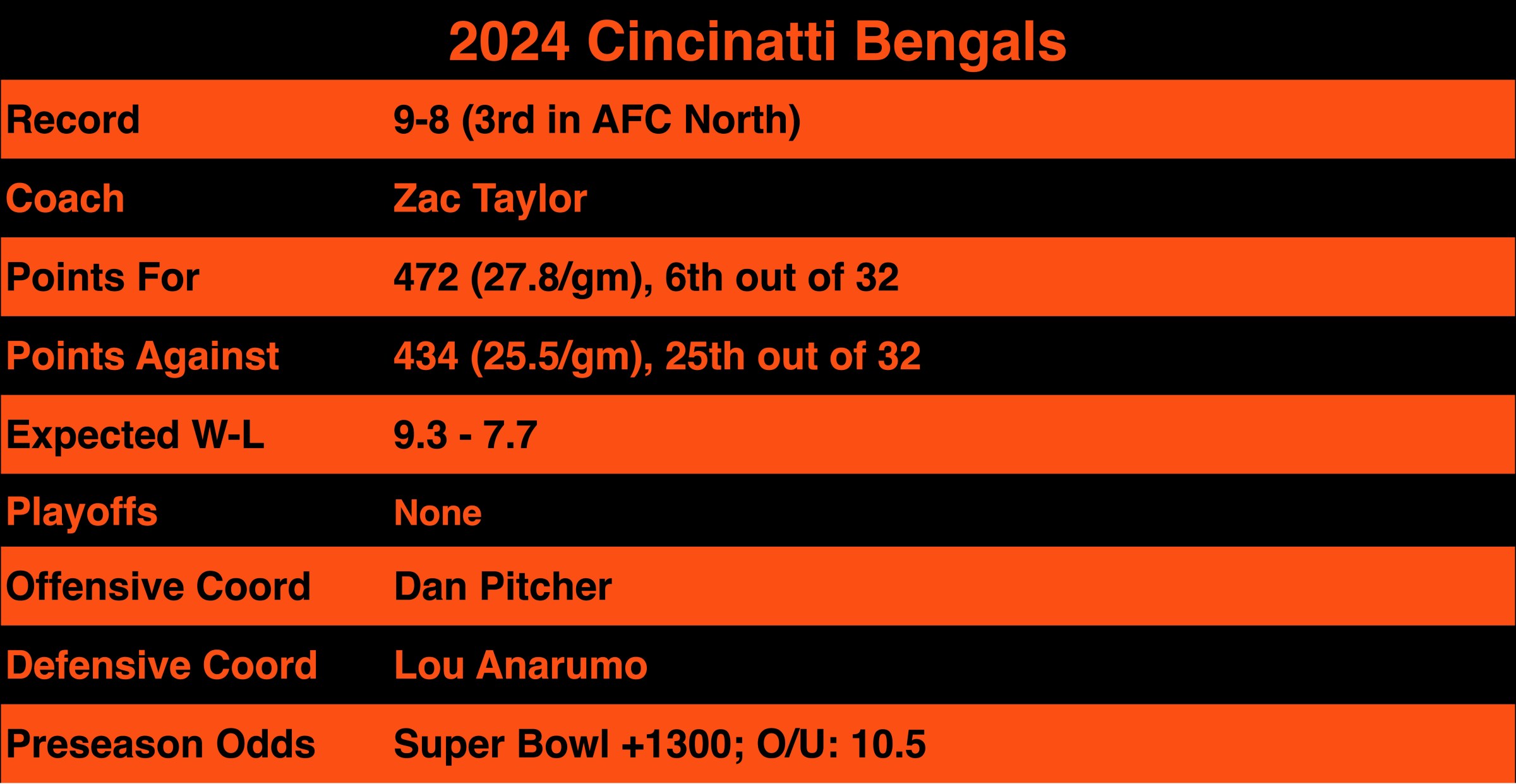 Expectations were high for the offense to remain elite, as analysts expected Burrow to continue to dominate — but there is notable concern over the offensive line, which ranked among the worst in pass protection and has allowed constant pressure. The running game remains a weak spot, with little added depth in the offseason and the Bengals projected to face one of the toughest schedules of run defenses. Defensively, the Bengals goal was to overcome its 2024 identity: bottom-tier in multiple metrics, only salvageable when edge rusher Trey Hendrickson was disruptive.