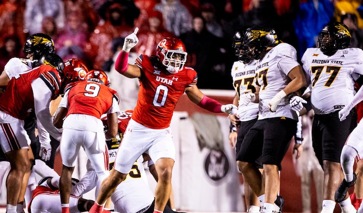 Utah defensive end Logan Fano (0) celebrates after an Arizona State field goal was foiled during an NCAA football game held at Rice-Eccles Stadium in Salt Lake City on Saturday, Oct. 11, 2025. | Isaac Hale, Deseret News