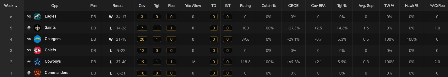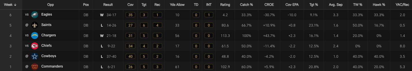 It helped that Flott had, easily, the best game of his career. Next Gen Stats credits him with allowing just 1 reception for 10 yards, while also getting an interception, in 3 targets. He allowed a -30.7 percent catch rate over expected and a coverage EPA of -10.
