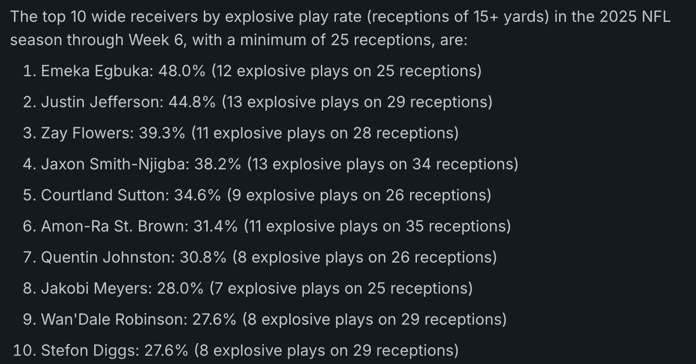 That last bit – it’s a little hard to quantify is how good JSN is at explosive plays. He has a 35+ yard reception in every game this season, the only such player.