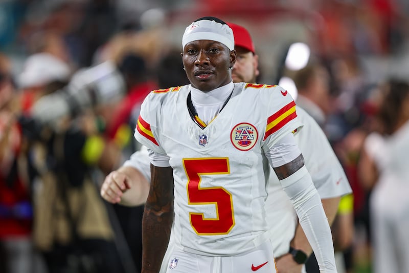 Hollywood Brown’s baptismKansas City Chiefs wide receiver Marquise Brown (5) leaves the field after warmups before an NFL football game against the Jacksonville Jaguars, Monday, Oct. 6, 2025, in Jacksonville, Fla. Jaguars defeated the Chiefs 31-28. | Gary McCullough, Associated Press