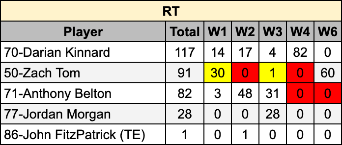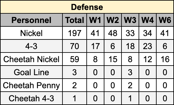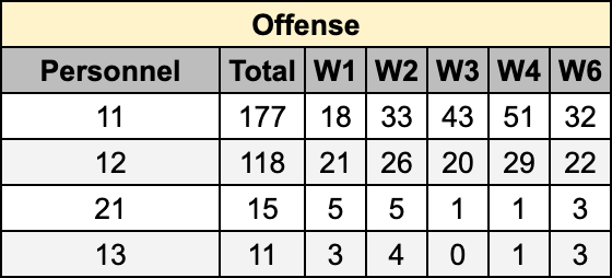 As always, these are snap counts that we personally have tracked throughout the year. The number in each cell corresponds to the number of snaps played, be it a personnel grouping or an individual player’s snaps, in specified weeks. Cells highlighted in yellow mean that a player dropped out of the game due to injury. Cells highlighted in red mean that a player missed the game entirely due to injury. Cells highlighted in black mean that a player was a healthy scratch for the game.