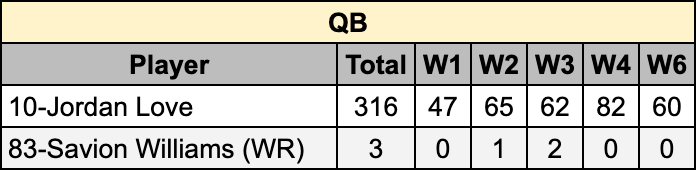 Savion Williams continues to be a gadget player for Green Bay’s offense. He played just 2 of the Packers’ first 48 plays on offense: a carry out of the backfield and a fake end-around on a play action shot.