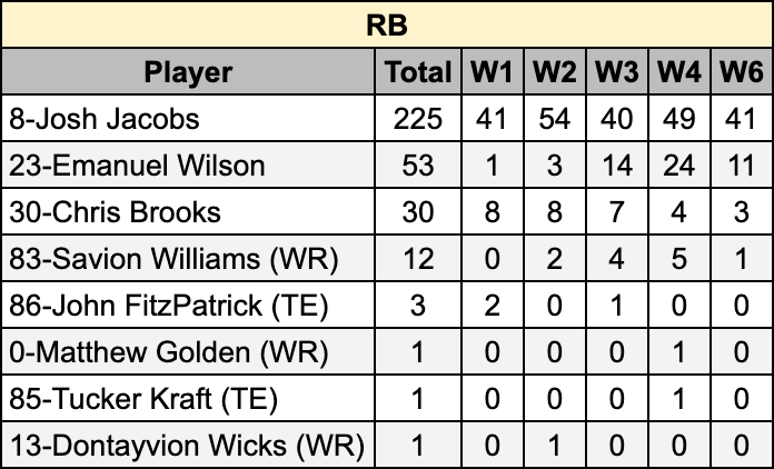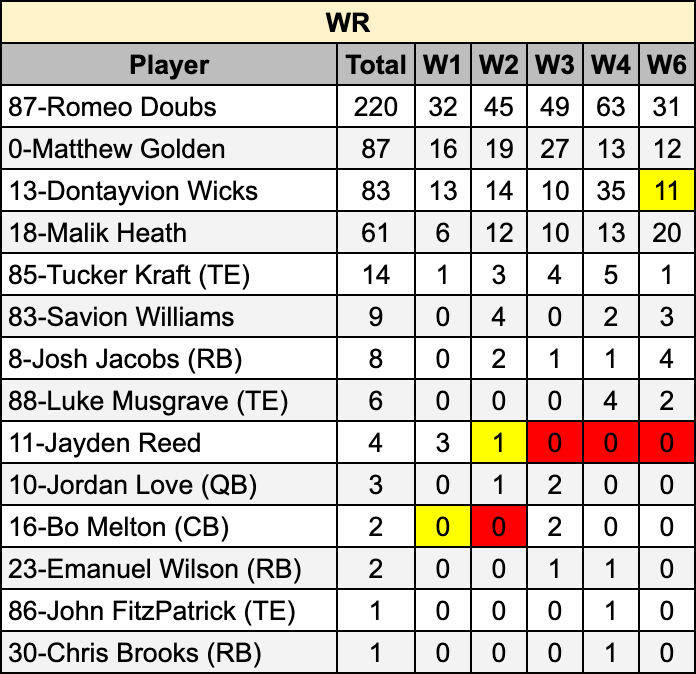 Overall, the Packers have seen a significant uptick in playing Tucker Kraft, Josh Jacobs and Luke Musgrave on the outside, too. Before Week 4, the team only used those non-receivers as outside players on just 11 total snaps (3.7 per game). In the last two games, they’ve played 17 combined (8.5). This allows other players, namely Romeo Doubs, to get some slot reps. Doubs had received 18 slot reps over the last two games (9 per game) compared to just 13 in the previous three (4.3).