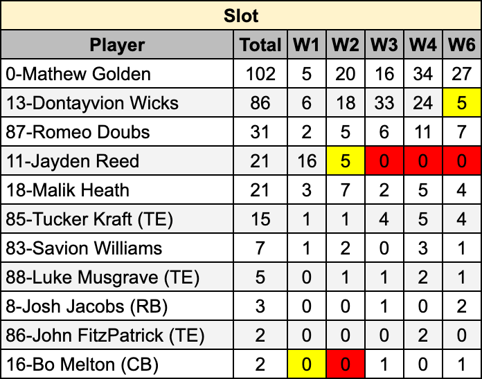 For the second game in a row, rookie Matthew Golden has primarily played in the slot for the Packers. Following Jayden Reed’s injury, the team first played Dontayvion Wicks in the slot in Week 3, before moving Wicks outside and Golden into the slot. When Wicks went down with an injury in Week 6, Malik Heath stepped up and played a lot of outside snaps in his place.
