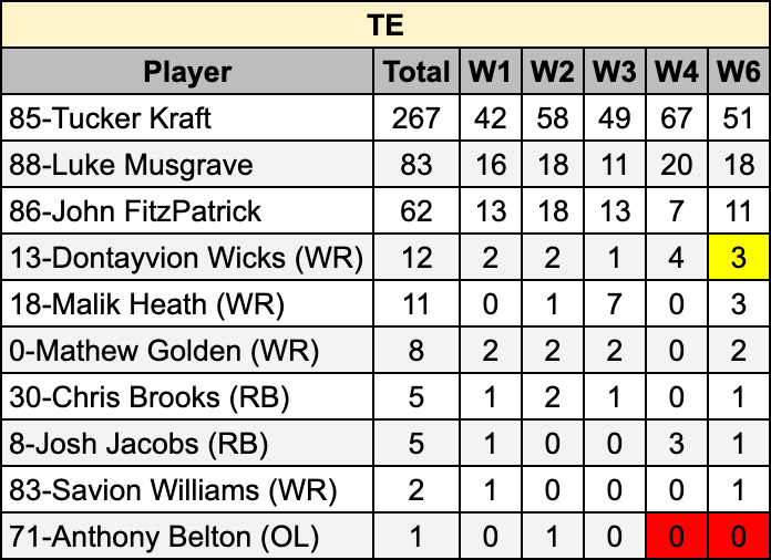 Luke Musgrave gradually lost playing time to John FitzPatrick from Week 1 to Week 3, but now he’s outsnapped FitzPatrick 38 to 18 in true tight end spots over the last two games. For whatever reason, Musgrave has regained control of the TE2 spot.