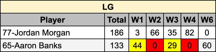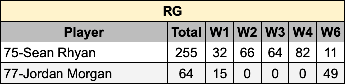 At right guard, Jordan Morgan and Sean Rhyan rotated at the position, with Rhyan playing just one drive before Morgan took over full-time. Before this game, Morgan had spent most of the season at left guard due to injuries to Aaron Banks.