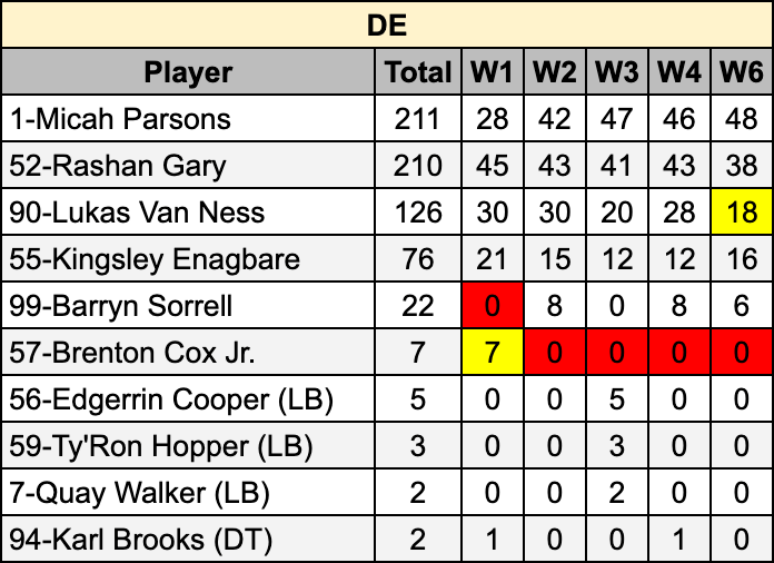 The big news at the position this week is that Lukas Van Ness was carted to the locker room with a foot injury. Without Van Ness, the Packers will need to lean on Micah Parsons, Rashan Gary and Kingsley Enagbare even more.