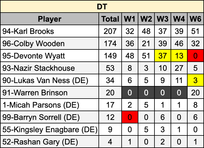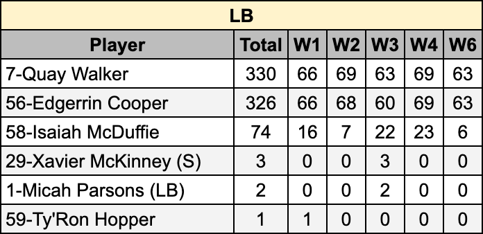 Also, shoutout to Karl Brooks, who played 51 snaps at defensive tackle this week, despite not even being a Week 1 starter on the team. That number ties the high for any defensive tackle in any game this year. He’s the one who picked up the most slack for Devonte Wyatt while Wyatt is out and dealing with a knee injury.