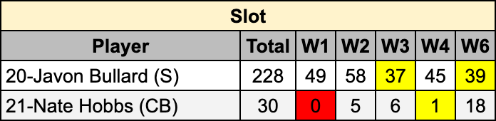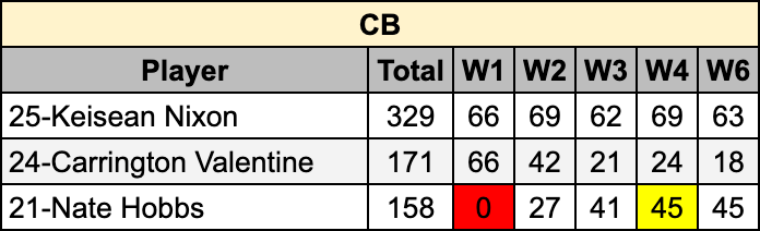 Nate Hobbs is the team’s preferred starting outside cornerback, whether you think that’s right or wrong, over the two weeks. The only times that Carrington Valentine has gotten into the mix at outside cornerback have been either after injuries in the secondary or in limited Cheetah package looks where Hobbs actually displaces Javon Bullard in the slot.