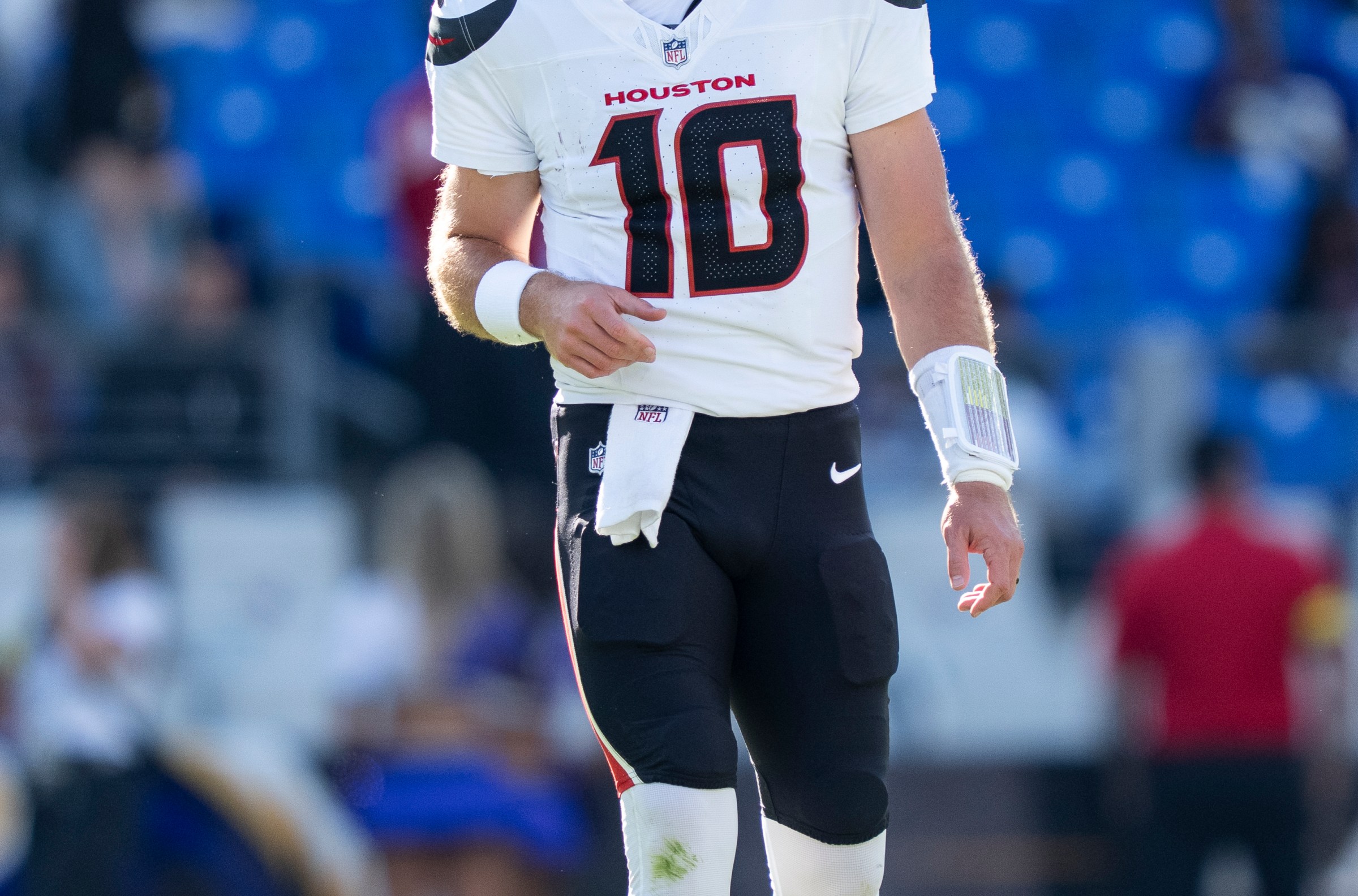 BALTIMORE, MARYLAND – OCTOBER 5: Davis Mills #10 of the Houston Texans looks on during an NFL football game against the Baltimore Ravens at M&T Bank Stadium on October 05, 2025 in Baltimore, Maryland. (Photo by Michael Owens/Getty Images) Getty Images