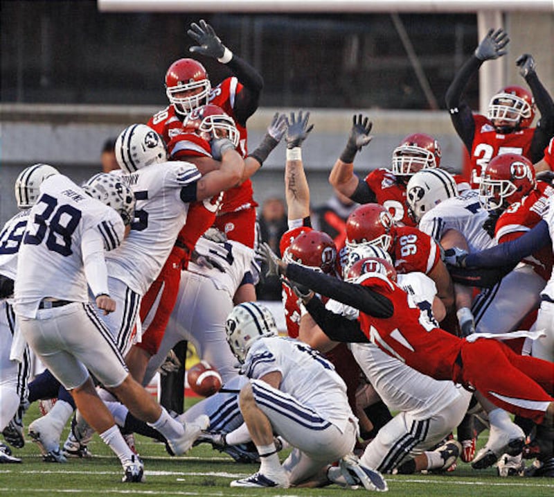 Utah’s Brandon Burton (lower right) blocks BYU’s Mitch Payne’s field goal attempt in the final second as Utah defeats BYU 17-16 Saturday, Nov. 27, 2010. | Tom Smart, Deseret News