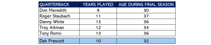It doesn’t take a 60+ year streak coming to an end to convey the aggravation of watching a strong showing from your franchise quarterback go to waste. It’s infuriating. Making matters worse is that Prescott is no spring chicken and doesn’t have many good years left. Looking at those franchise quarterbacks again, here is how long they played and their age during their final year in the league.