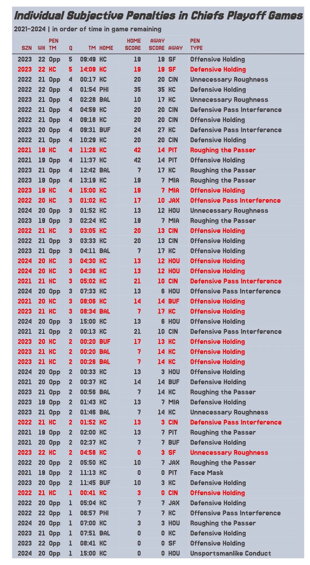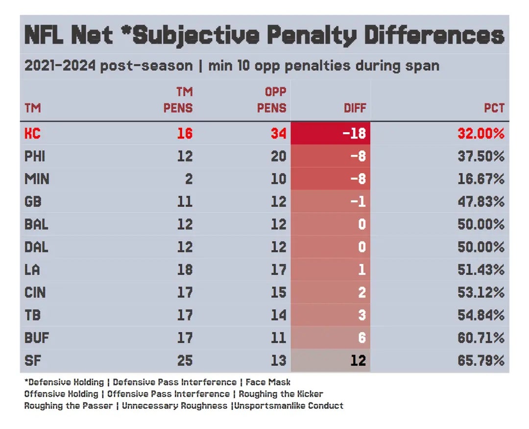 Quick TL;DR for my blog above on all this. I looked just at 2021-2024 which isolates to Mahomes’ playing years (even his rookie year in which he didn’t play in the Playoffs although I could probably have just removed that). If you just consider subjective penalties, the Chiefs had the largest difference vs their Playoff opponents.Â